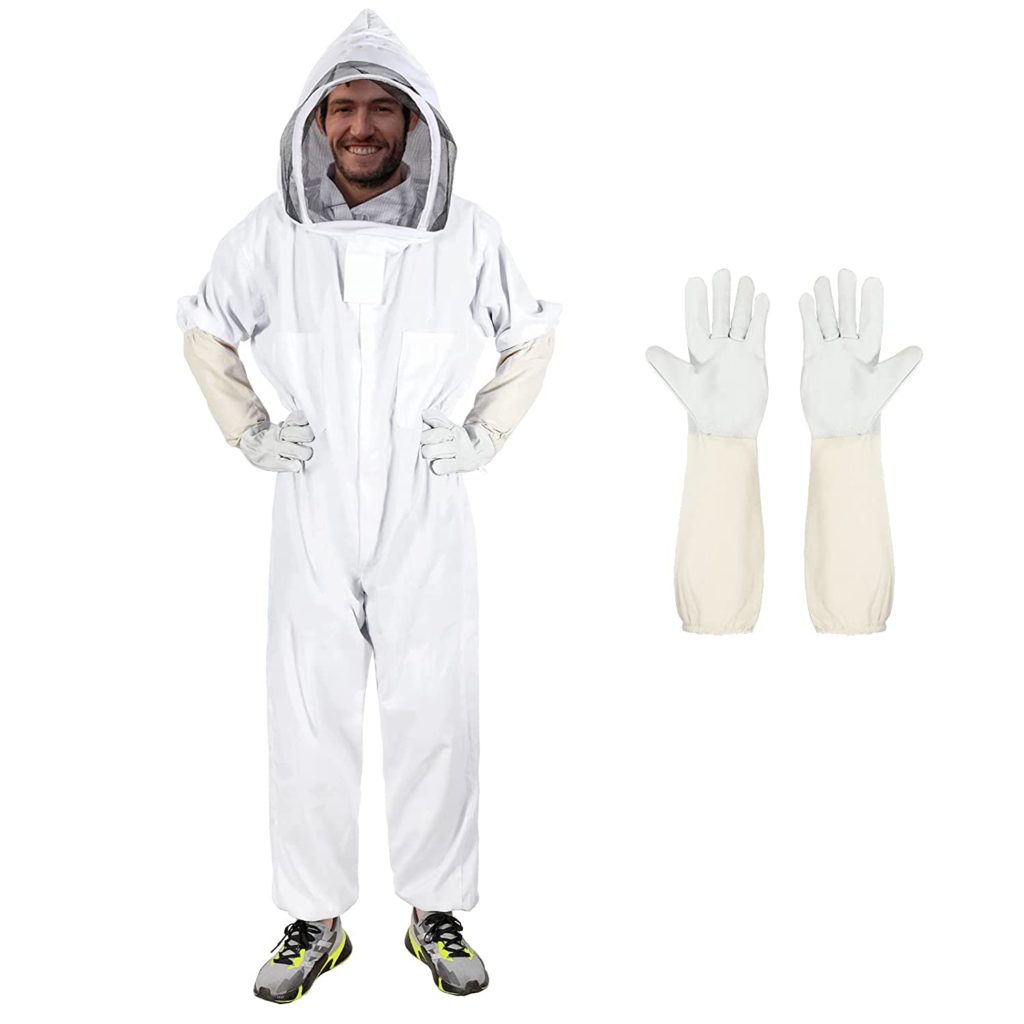 Traje de apicultor: El traje de apicultor es una pieza clave del equipo de protección personal de un apicultor. Está diseñado para cubrir todo el cuerpo del apicultor y protegerlo de las picaduras de las abejas. El traje generalmente está hecho de un material ligero y transpirable, con una malla en la zona de la cabeza y el rostro para permitir la visibilidad y la ventilación.